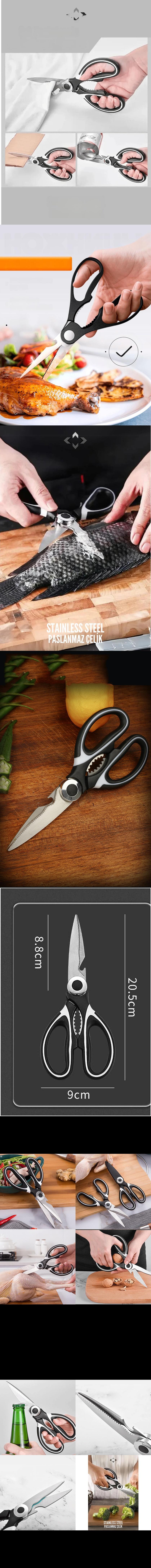 Ergonomik Kollar. Makas Tasarımında Fındık Kırıcı ve Şişe Açacağı, Çok İşlevli Ayırt Edilebilir Makaslar, mutfak alet çantanızda bulundurmak için ideal bir araçtır. Bu makaslar, balıkların kemiklerinin ayıklanması ve pullarının ayıklanması ve sebzelerin soyulması gibi çok sayıda görevi kolaylıkla yerine getirebilir. Merkezde çelik dişler bulunan bu makasları, deniz ürünleri kabuklarının yanı sıra sert fındıkları kırmak için kullanabilirsiniz. Keskin paslanmaz çelik bıçaklara sahip, Uzun Ömürlü Kullanım için Yüksek Kaliteli Malzemelerden Üretilmiştir