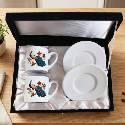 Zerya Hobi Tavus Kuşu Tasarımlı Kadife Siyah Renkli Kutulu 2 li Porselen Kahve Fincan Seti - Tavus Kuşlu Siyah Kahve Fincanları