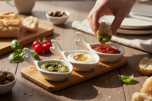 3’lü Porselen Sosluk & Mezelik Seti – Bambu Sunum Tahtalı Şık Servis Seti