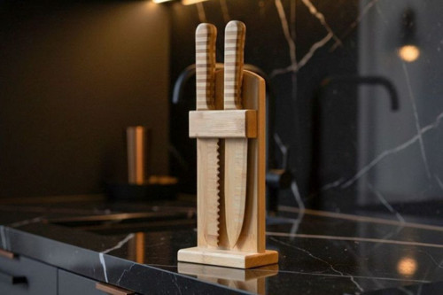 Doğal Bambu Bıçak Seti – 2’li Şef & Ekmek Bıçağı + Bambu Blok Stand