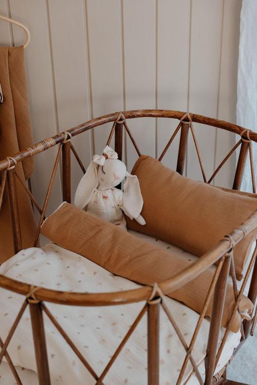 Ürünümüz %100 müslin ve %100 pamuklu poplin kumaşlardan üretilmiş ve organik sertifikalı boyalarla baskı yapılmıştır | Set içeriği 60x100 cm müslin nevresim, 25x45 cm müslin yastık kılıfı ve %100 pamuklu poplin kumaştan üretilmiş, 100x120 cm ölçüsünde baskılı çarşaf şeklindedir | Anne Yanı Beşik Uyku Seti
