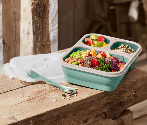Katlanabilir Beslenme Kutusu Renk: Silikon ve kaşık griKapak buzlu şeffaf Malzeme: Kutu %100 silikonKapak, çerçeve ve kaşık %100 polipropilen Ölçüler: G x Y x D yakl. ; 25 x 18 x 7 cm, katlanmış şekilde yakl. ; 25 x 18 x 3,5 cmKaşık yakl. ; 16,5 x 3 cm İçerik/Aksesuar: Kaşık ve kullanma talimatları dahildir Ağırlık: Yakl. ; 410 g 3 adet farklı bölme|Çatal ve kaşık kombinasyonlu – kapakta az yer kaplayacak şekilde saklanır|İnce şekilde katlanabilir ve yer kaplamaz|Klipsli kilitleri sayesinde kolay açılır ve kapanır|Yiyecekleri saklamak, ısıtmak, dondurmak ve taşımak için;