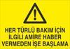 Her Türlü Bakım İçin İlgili Amire Bilgi Vermeden İşe Başlama Uyarı Levhası