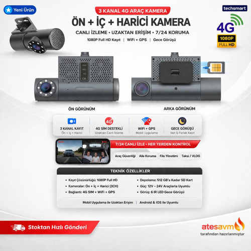 Techsmart 3 Kanal 4G Araç Kamera | Ön + İç + Harici Kamera | 1080P Full HD, WiFi, GPS, Gece Görüşlü DVR