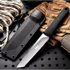 Valkyrie Paslanmaz Soğuk Çelik Tırtıklı 9CR18 Boyun Askılı Kılıflı Kamp Av Bıçağı Gümüş