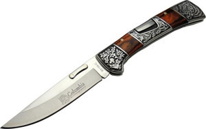 Columbia B3159 A Kahverengi Av / Kamp Çakısı 22cm- Gül Ağacı Sap, Kaplan Işlemeli, Kemerlikli
