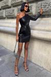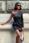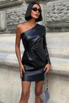 Zarif tasarımıyla dikkat çeken tek kol deri elbise, siyah rengin asaletini yansıtır.