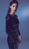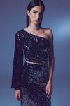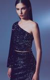 Asimetrik yaka, yan fermuarlı, iç astarlı, tek uzun ve balon kol, payetli crop bluz.