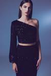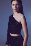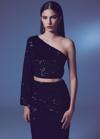 Asimetrik yaka, yan fermuarlı, iç astarlı, tek uzun ve balon kol, payetli crop bluz.