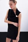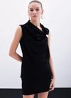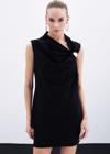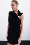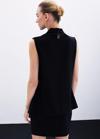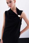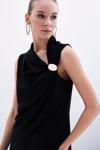 Ön asimetrik kesim, arka yaka düğmeli kapama, kalça altı boy, tel omuz gold aksesuarlı bluz.