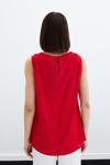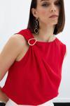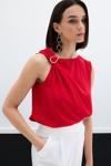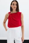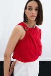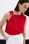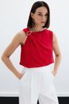 Asimetrik yaka, arka yaka düğmeli, kalça altı boy, kolsuz, tek omuz gold aksesuarlı bluz.