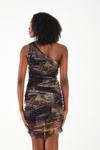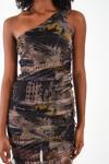 - Zarif tasarımıyla dikkat çeken tek omuz tül elbise, dijital baskı teknolojisi ile üretilmiştir.