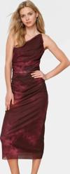 Bu nefes kesici bordo elbiseyle kendinizi özel hissedeceksiniz! Tek omuzlu tasarımı ve bodycon kesimiyle vücut hatlarınızı mükemmel bir şekilde sergiler. Yüksek kaliteli örme tül kumaş, hem şık bir görünüm hem de gün boyu süren konfor sağlar. Elbisenin midi boyu ve zarif aksesuar detayları, onu hem gündüz hem de gece kullanımına uygun hale getirir.