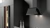 Özel mat siyah yüzey üstünde bakır rengi detaylara sahip cam davlumbaz