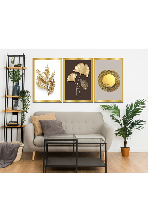 Tekin Store Gold Aynalı Pleksi Çerçeveli Çiçek Üçlü Mdf Tablo Seti
