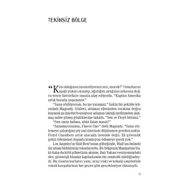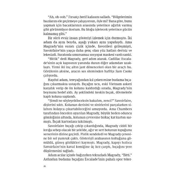 “…Magrady gece terlemeleriyle başarısızlık bataklığında uyandığında, gece yarısı biri geçiyordu. Askerlik arkadaşı Red Spencer’ın garajına düşmüştü son birkaç haftadır. Kalbi kulaklarında davul çalıyordu. Orada olmayan bir şişe viskiye doğru davrandı. Kargaşa kafasında sarı-sıcağa dönmüştü yine. İçki. Kokain. Haplar. Grup seansları arada sırada Gazi İşleri Başkanlığı’nın tesislerinde devam ediyordu. Seanslar yardımcı olmuş ve durdurmuşsa da hiçbiri acının geri dönmesini engelleyememişti. Kanepede sırt üstü uzandı, uyuması mümkün değildi…”