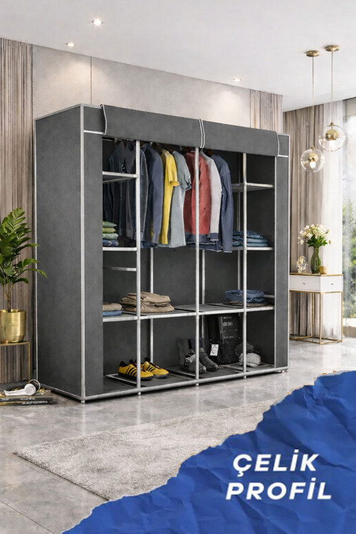 Dayanıklı iskelet yapısı ve fermuarlı bez dolap kaplaması sayesinde eşyalarınızı tozdan ve kirden korur.
