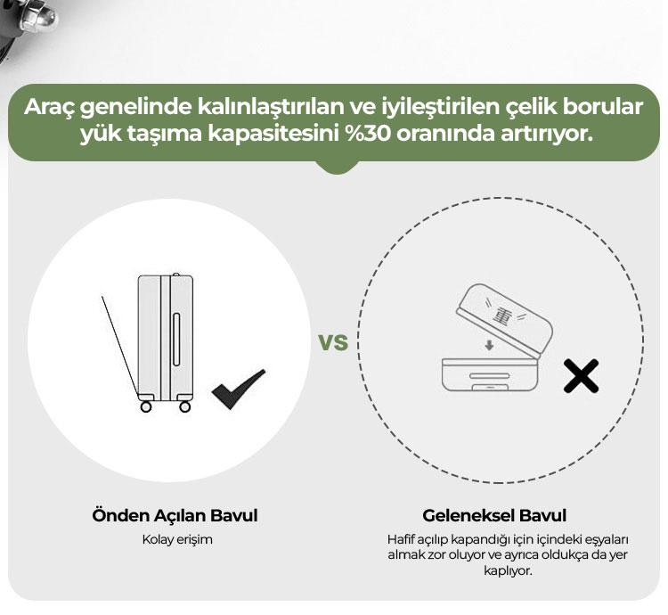 - Yüksek Taşıma Kapasitesi: Maksimum 110 kg yük taşıma kapasitesine sahiptir.
