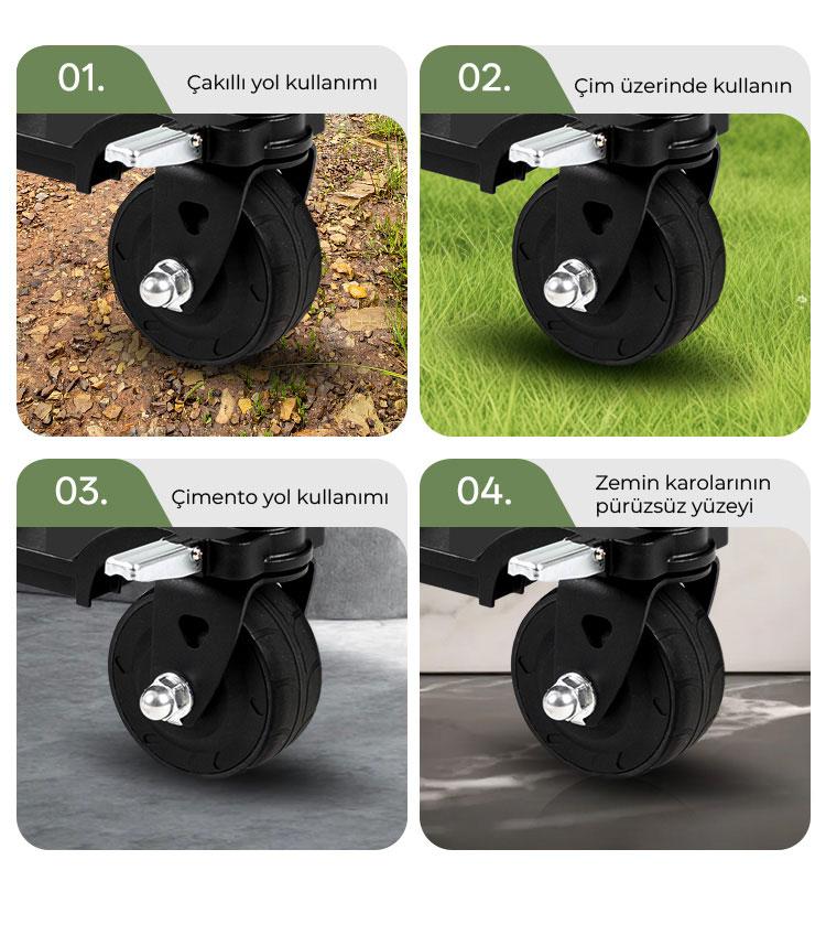 - Tekerlekler: Her türlü araziye uygun, dayanıklı 4 inçlik döner tekerlekler ile konforlu sürüş sağlar.