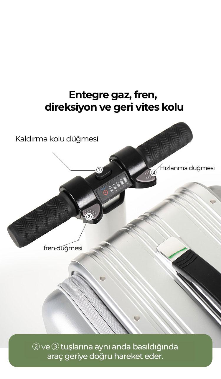 Bu ürün, seyahatlerinizde hem eşyalarınızı taşıyan şık bir valiz hem de sizi yormadan taşıyan elektrikli bir scooter olarak tasarlanmıştır.
