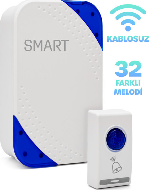 Telvesse Kablosuz Uzaktan Kumanda Kapı Zili Işıklı Uzun Menzilli Pilli 32 Farklı Melodili Mavi-Beyaz 9402