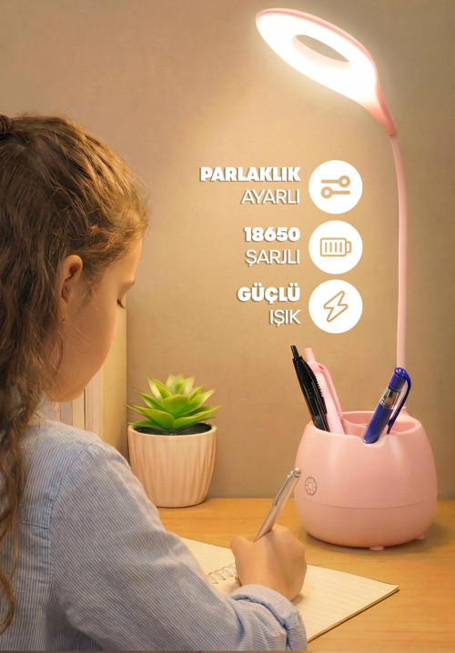 Telvesse Şarjlı Masa Lambası Işık Ayarlanabilir Kalemlik Telefon Stand Ders Çalışma Okuma Işığı 0620 Pembe