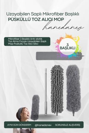 Mikrofiber 3 Başlıklı Anti-statik Toz Alma Fırçası Uzayabilen Saplı Mop Püsküllü Toz Alıcı Silici