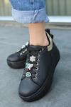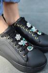 Kazax Tenya Siyah Cilt Taşlı Bağcıklı Spor Ayakkabı