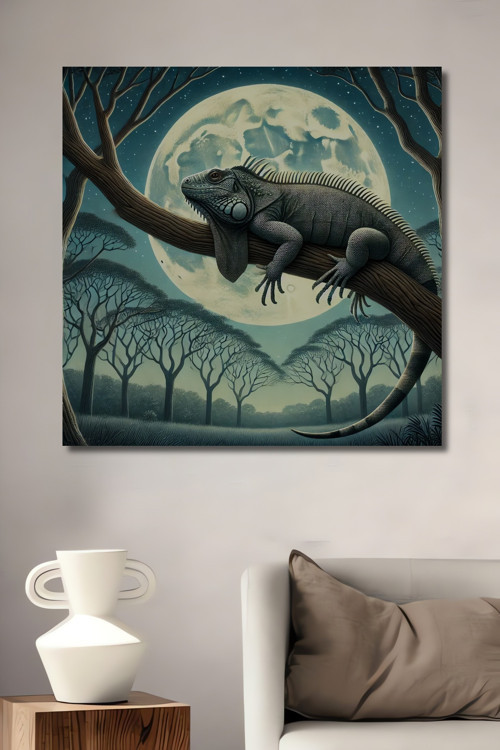 Teona Ahşap Ay Işığı Altında İguana Dekoratif Ahşap Mdf Dikdörtgen Ev,İşyeri Duvar Tablo