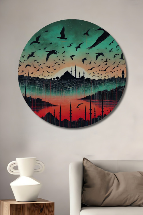 İstanbul Manzarası Kuşlar Ve Camiler İle Dekoratif Ahşap Yuvarlak Ev,İşyeri Duvar Tablo