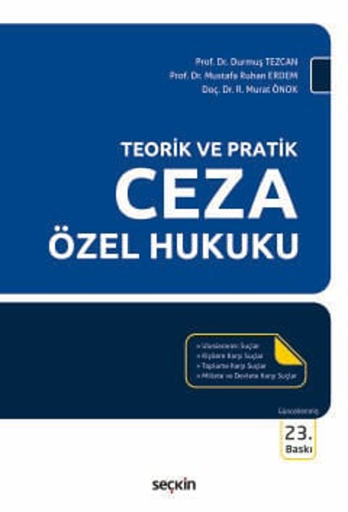 Seçkin Yayıncılık Teorik ve Pratik Ceza Özel Hukuku Prof. Dr. Durmuş Tezcan,Prof. Dr. Mustafa Ruhan Erdem,Doç. Dr. Rıfat Murat Önok 23. Baskı, Eylül 2025 9786253813109 Kitabının amacı, gerek uygulamacılara gerekse öğrencilere, anlatılan konulara dair hem teorik hem pratik bilgiyi sunmaktır. Her baskıda, tartışılan konulara dair farklı akademik görüşler ve yaklaşımlar okuyucuya sunulduğu gibi, doktriner gelişmeler ve mevzuattaki değişiklikler de düzenli olarak takip edilmektedir. Kitabın adında "pratik" ibaresinin yer almasının nedeni, uygulamada görülen sorunlara çözüm önerileri sunulması ve en güncel Yargıtay içtihatlarının eleştirel bir yaklaşımla değerlendirilmek suretiyle aktarılmasıdır. Böylece kitapta hem mevcut teori ve pratik hakkında okuyucuya bilgi sunulması hem de olması gereken açısından yasa koyucuya ve uygulamaya ışık tutulması hedeflenmektedir.