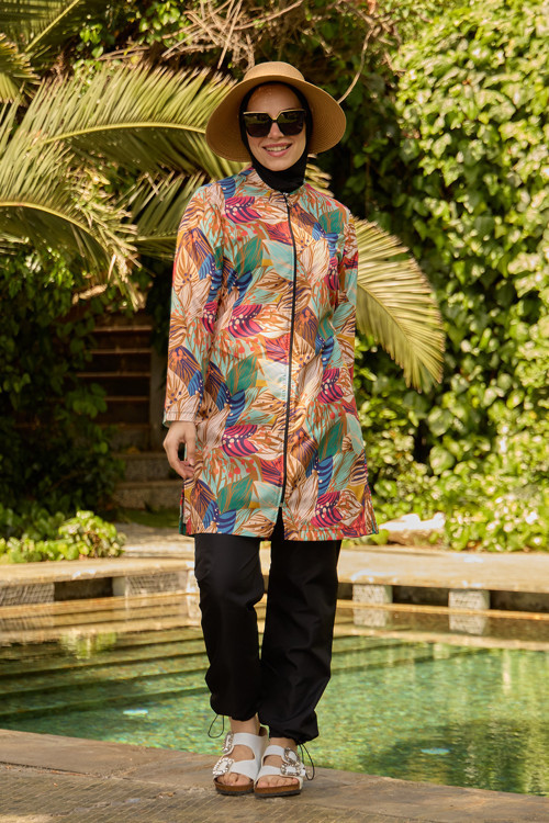Rahat kesim tam kapalı mayo takımında paraşüt pantolon ve tunik, likralı eşarp ve büstiyer vardır.