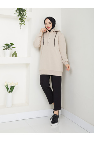 Bej 3 İplik Yarım Fermuarlı Sweat