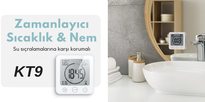 Ortam iklimlendirme takibi ve zaman yönetimini birleştiren KT9; sıcaklık, nem, zamanlayıcı ve saat fonksiyonlarını dokunmatik bir arayüzde sunar. Vantuzlu veya mıknatıslı sabitleme sistemi, cihazın metal veya pürüzsüz yüzeylerde güvenle konumlandırılmasını sağlayarak ergonomik ve profesyonel bir kullanım deneyimi yaratır.