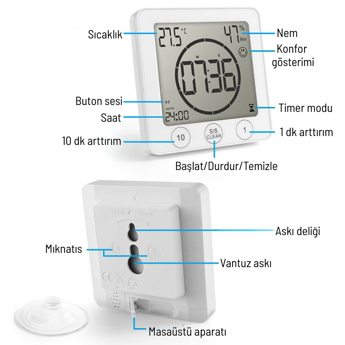 Banyo: Vantuz özelliği ile aynaya veya fayansa yapıştırılarak duş sırasında zamanı takip etmek ve aşırı nem oluşumunu (küf riskine karşı) kontrol etmek için.