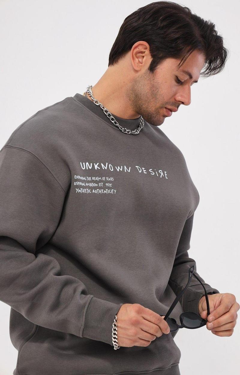The Champ Clothing Bisiklet Yaka Içi Polar Unknown Desire Yazı Baskılı Füme Oversize Hoodie Sweatshirt