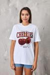 "Cherries Yazılı Kiraz Tasarım Baskılı Beyaz Kadın T-shirt" ile stilinizi tatlı ve enerjik bir şekilde yansıtın.