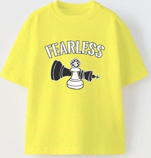 "Fearless" yazılı satranç tasarım baskılı sarı çocuk t-shirt ile küçük oyuncularınıza cesaret ve tarz kazandırın!