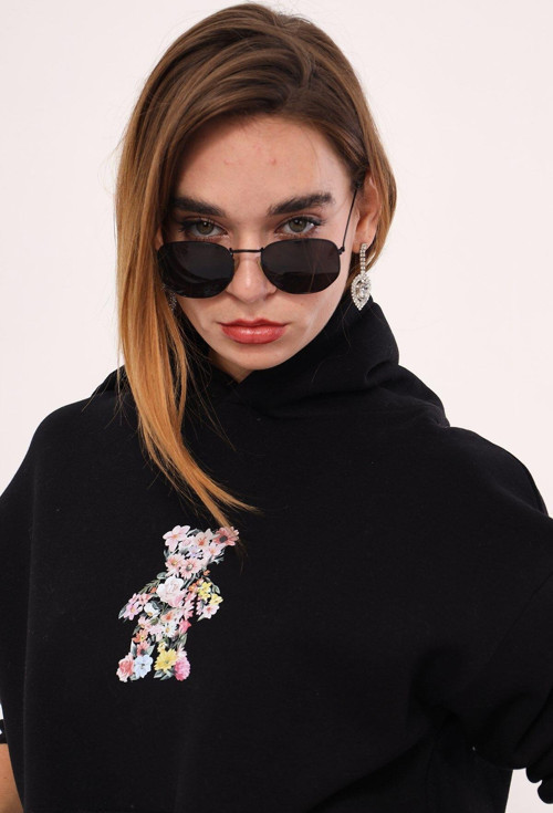 The Champ Clothing Kapüşonlu Içi Polar Çiçekli Teddy Bear Baskılı Siyah Unisex Hoodie Sweatshirt