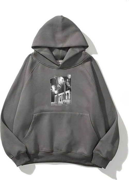Kapüşonlu İçi Polar Kemal Atatürk 10 Kasım Baskılı Füme Unisex Sweatshirt Bu kapüşonlu unisex sweatshirt, 10 Kasım’ı anmak ve Kemal Atatürk’e olan saygıyı ifade etmek için özel olarak tasarlandı. İç polar astarı, soğuk günlerde sizi sıcak tutarken, füme renginin sofistike ve zarif tonu ile şıklık sunar. Üzerindeki “Kemal Atatürk 10 Kasım” baskısı, bu özel günü anlamlı bir şekilde onurlandırır. Hem kadınlar hem de erkekler için uygun olan bu sweatshirt, kaliteli kumaşı ve rahat kesimi ile günlük kullanımda mükemmel bir seçimdir. Özellikler: Kapüşonlu tasarım
