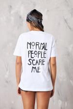 "Normal People Scare Me Yazı Baskılı Oversize Beyaz Kadın T-Shirt" ile stilinizi ve kişiliğinizi öne çıkarın. Şimdi sipariş verin ve gardırobunuza bu şık ve cesur parçayı ekleyin!