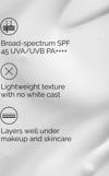Ciltte beyaz iz bırakmayan, günlük kullanım için ideal, SPF 45 koruma sağlayan hafif yapılı güneş serumu.