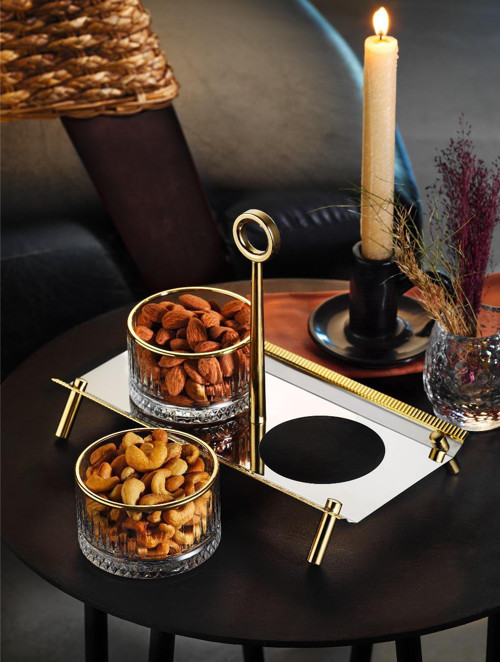 TİAMO MİOS 2’li Çerezlik Gold, zarif gold detayları ve modern tasarımıyla sunumlarınıza şıklık katar. Çerez, kuru yemiş, lokum ve atıştırmalıklar için ideal olan bu set, misafir ağırlamalarında sofralarınıza estetik bir görünüm kazandırır. Şık tasarımı sayesinde günlük kullanımın yanı sıra özel davetlerde de rahatlıkla tercih edilebilir. Dekoratif yapısıyla sunumlarınıza değer katan zarif bir tamamlayıcıdır.