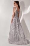 Detay: V yaka, sırtı dekolteli, tül detaylı, arka fermuar kapamalı, boncuk işlemeli, çiçek aplikeli, kuyruklu abiye elbise;