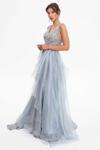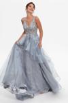 Detay:  Kalın askılı, V yaka, illüzyon detaylı, boncuk süslemeli, nakışlı, sırtı dekolteli, arkası fermuar kapamalı, kat kat tül etekli, kuyruklu, uzun abiye elbise;