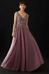 kemerli, fermuar kapamalı, üst bedeni taş işlemeli, astarlı abiye elbise;