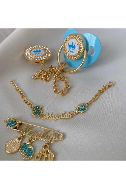 Tiny Wood Altın Kaplama Zirkon Taşlı Emzik Seti – Maşallah İğnesi & Bebek Künyesi Dahil