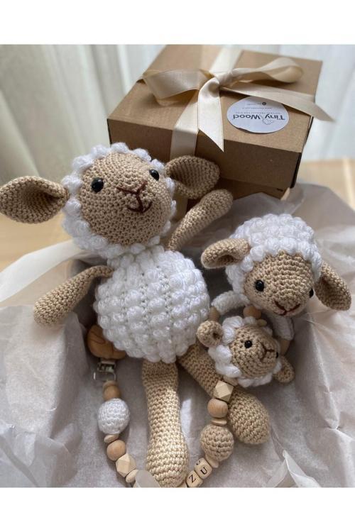 Hoş geldin Bebek, Unisex,Yenidoğan Bebek İsimli Emzik Askısı Hediye Seti Annesinin Kuzusu setimiz, doğal ahşap ve sertifikalı iplerden örülmüş bir bebek hediye paketidir.