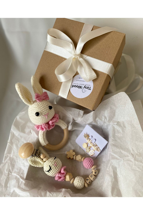 Tiny Wood Hoşgeldin Bebek, Yenidoğan Kız Bebek Isimli Emzik Askısı Hediye Seti, Bebek Hediyelik Organik