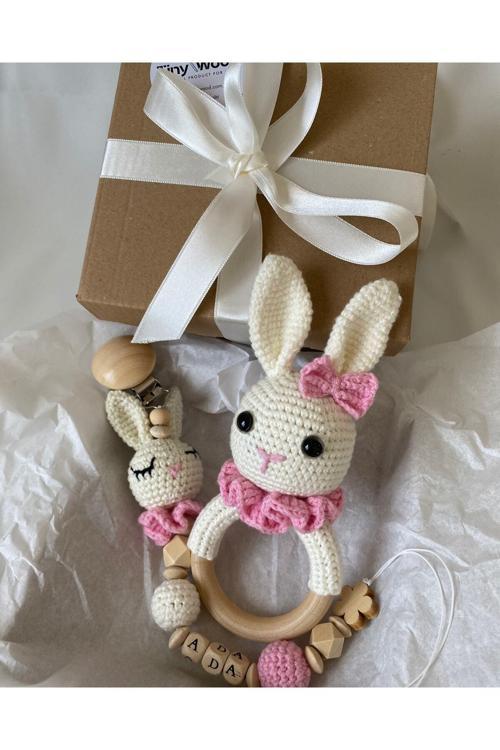 Tiny Wood Krem - Pembe Hediyelik Tavşan Emzik Zinciri Çıngırak, Yenidoğan Kız Bebek Isimli Emzik Hediye Seti